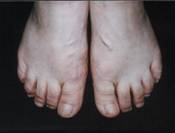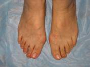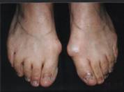 拇外翻俗稱“大觚拐”,是好發(fā)于女性朋友(男女比例約1:30)的一種常見足部畸形,多呈對稱性。它的主要表現(xiàn)就是: 足拇趾斜向外側(cè),第一跖骨內(nèi)翻,第一二跖骨間夾角增大,跖拇關(guān)節(jié)輕度半脫位;第一跖骨頭在足內(nèi)側(cè)形成一骨贅,因長期受鞋幫的摩擦,局部皮膚增厚,嚴(yán)重時紅腫發(fā)炎,即形成我們所說的拇囊炎。拇外翻嚴(yán)重時,第二趾可被拇趾擠向背側(cè),形成錘狀指。拇外翻的發(fā)病跟遺傳有關(guān),另外,經(jīng)常穿尖頭鞋或高跟鞋站立過久、行走過多也是造成拇外翻的常見病因?;颊呔驮\的主要目的是為解除行走時的局部疼痛,也有一些年輕的女性朋友是為了使雙腳外形美觀,能繼續(xù)穿時髦的高跟鞋來尋求幫助。